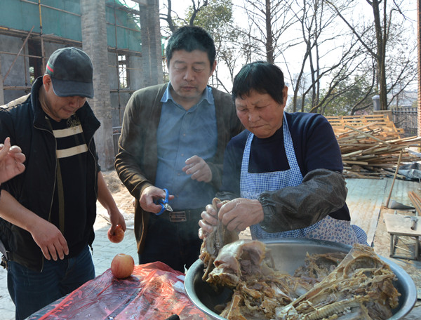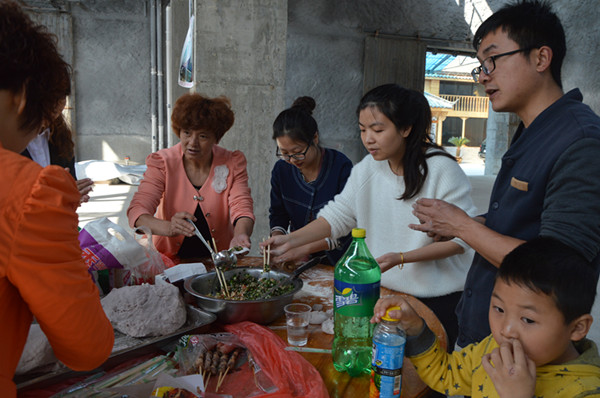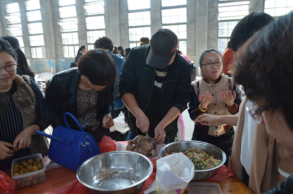 這邊包餃子的問(wèn)題正討論的激烈,那邊熱氣騰騰的豬頭也出鍋了?!把?,這么大的豬頭,小時(shí)候過(guò)年的感覺(jué)”?!皩?duì)啊,對(duì)啊,這種氣氛,這種味道,太有紀(jì)念意義了”。“來(lái)來(lái)來(lái),我拍張照片,微信朋友圈曬一曬”。黃色餃子、綠色餃子、紅色餃子、紫色餃子相繼的出鍋了,燒烤的食品也相繼出爐,大家互相品評(píng),因?yàn)槎际亲约簞?dòng)手參與,一切都變成了美食。