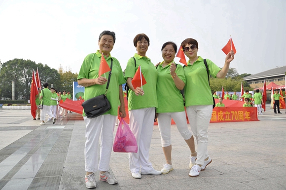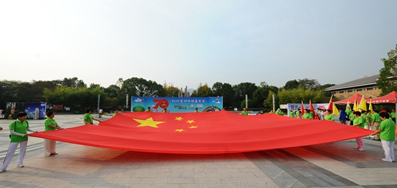 9月29日一早的濱水公園,在8面紅旗和8面麗汽集團(tuán)司旗的簇?fù)硐拢?/span>16名旗手莊重地鋪展開一面巨幅國旗。早早趕來的麗汽員工和在公園晨練的市民紛紛在國旗前拍照留念。那一抹鮮艷的中國紅,映照出的不僅是人們的笑臉,還有所有人心中對祖國的依戀。