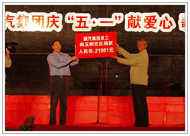 演唱會(huì)上,麗汽集團(tuán)員工為玉樹(shù)地震災(zāi)區(qū)進(jìn)行了捐款,所募集的21981元善款轉(zhuǎn)交市慈善總會(huì)。