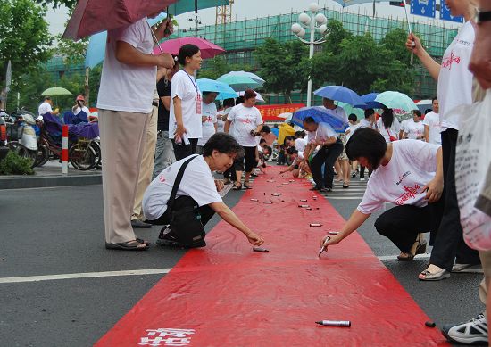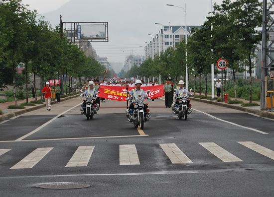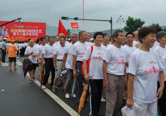 健步走隊伍在麗水市委書記陳榮高的帶領(lǐng)下,從濱水公園出發(fā),沿著花園路-囿山路-宇雷路-江濱路返回濱水公園,盡管活動開始后不久,天空就下起了小雨,但是這絲毫沒能阻擋大家的熱情,隊伍冒雨堅持走完了全程。到達終點后,大家在印有麗水市“全民健身日”暨萬人健步走活動的橫幅上簽字。