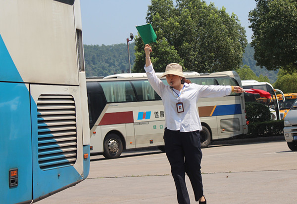 8月3日上午10:30分,地表溫度已經(jīng)接近50攝氏度,走在室外,隔著鞋底就能感受到地面上滾燙的溫度,行車員洪麗頭頂烈日,認真地為車輛引航,吹哨、倒走、揮動紅綠旗、小跑……一套動作下來,豆大的汗水從額頭滴下來。