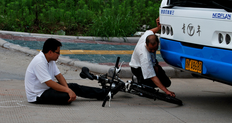 場景二:模擬一輛快客班車滿載旅客從客運西站發(fā)車,行駛在公路上,由于一輛騎自行車人從右向左突然橫穿,駕駛員采取避讓和制動措施不及,與自行車發(fā)生碰撞,導致騎車人受傷倒地。駕駛員立即停車查看騎車人受傷情況,打110報警和打120急救,將事故情況報告至快客公司,設置好現(xiàn)場警示牌,勸導下車的旅客回車內(nèi),快客公司安排車輛前往事故地點進行駁客,同時快客公司分管安全的經(jīng)理和安全員一起前往事故現(xiàn)場。交警到達現(xiàn)場,進行事故現(xiàn)場勘查;120急救車到達現(xiàn)場,帶走受傷騎車人;快客公司分管安全的經(jīng)理和安全員到達事故現(xiàn)場;駁客車到達現(xiàn)場,將事故車輛乘客駁走。