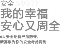 安全安全籠式車身、井字鋼梁、潰縮空間設計 4輪29次安全碰撞測試,以國際安全標準呵護您的旅程 ABS+EBD、五座標準安全帶(前排帶預張緊功能) 全系標配雙安全氣囊、安全碰撞可潰縮吸能轉向柱 后排車門兒童安全鎖和后排IS0FIX兒童安全座椅固定裝置 行人保護安全車頭雙翼區(qū)