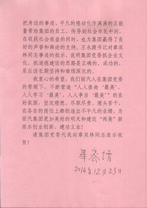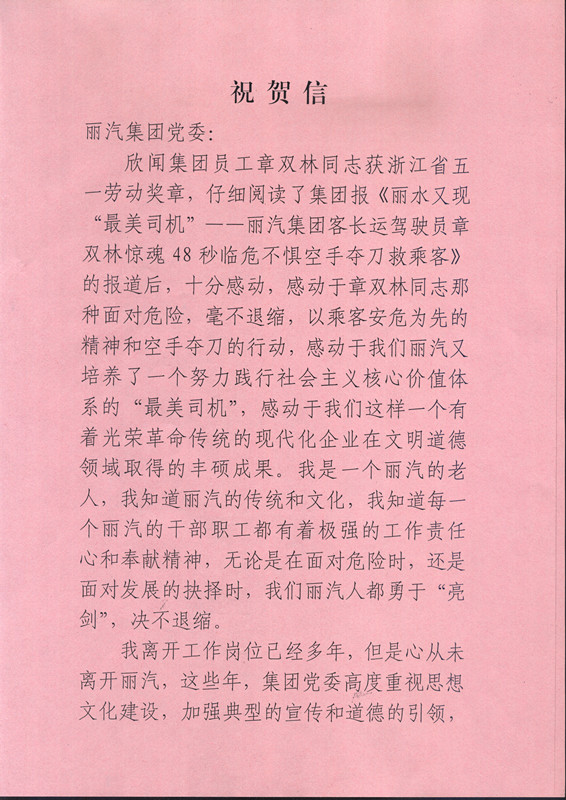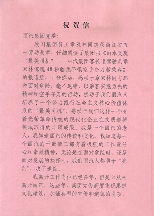 集團公司客長運司機章雙林臨危不懼空手奪刀的先進事跡,不僅受到全社會的高度關(guān)注,在感動著社會、感動著廣大員工的同時,也感動了離退休老同志。25日,集團公司離休干部、年逾90高齡的畢密增同志專門發(fā)來賀信,高度肯定了集團公司的思想文化建設,也表達了對章雙林的祝賀。
