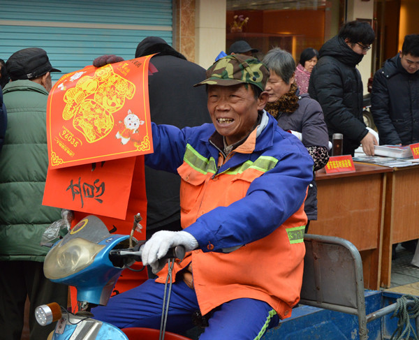 環(huán)衛(wèi)工人接過(guò)麗汽集團(tuán)黨員送上的福字和春聯(lián)臉上樂(lè)開(kāi)了花