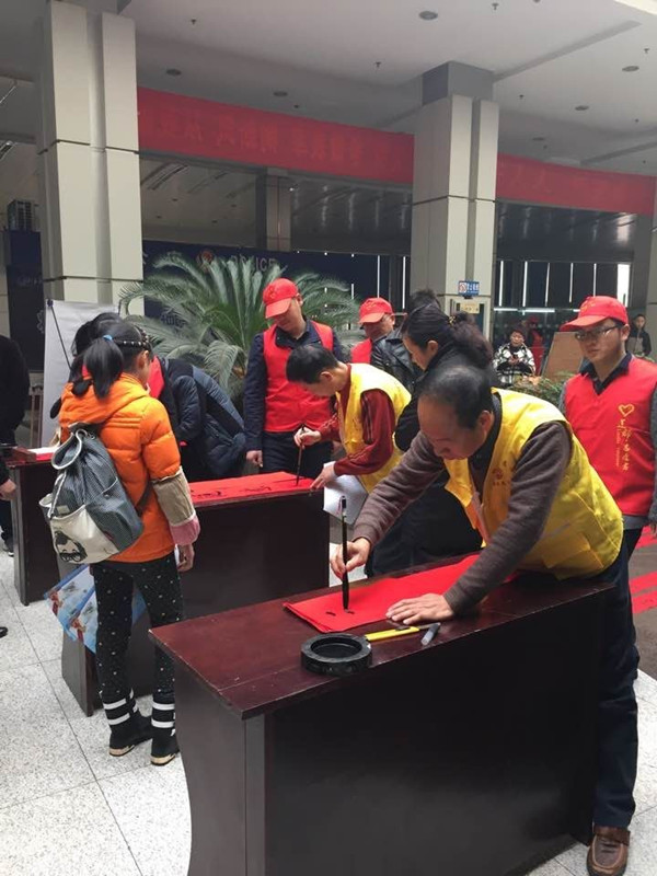 總工會的志愿服務隊伍還帶來了“志愿者書寫春聯(lián)”,現(xiàn)場寫就的200多幅春聯(lián)很快就被乘客們領(lǐng)取一空。