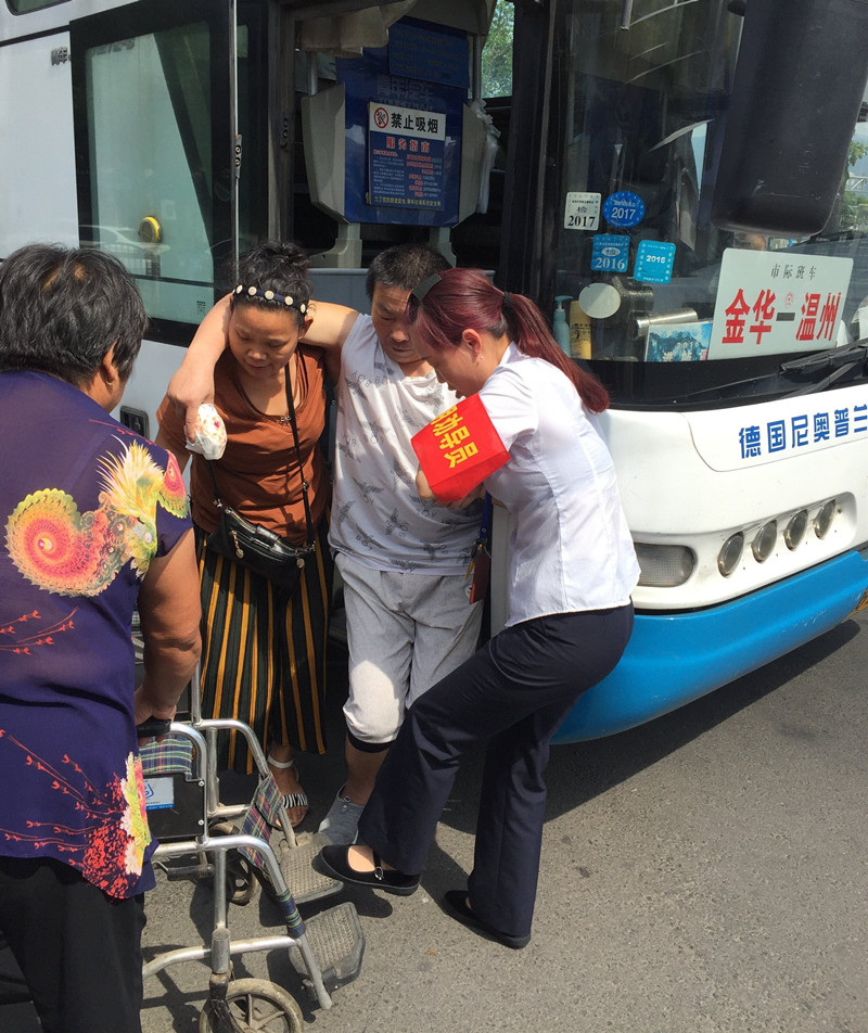 9:35金華到麗水的班車緩緩地駛進(jìn)了高鐵配載點(diǎn)。車一停穩(wěn),旅客們便陸陸續(xù)續(xù)的下車前往下一個(gè)目的地。眼尖的江旭紅看見一位中年婦女在車門處很吃力的拉著什么,江旭紅心想,車上可能有行動(dòng)不便的旅客需要下車。江旭紅全然不顧烈日的暴曬,毫不猶豫的迎上前去。果不其然,車門處的阿姨和車上的另一個(gè)阿姨正連拉帶抱的幫一位行動(dòng)不便的大叔下車。大叔看上去50多歲的樣子,因?yàn)榈昧四撤N疾病一點(diǎn)都不會(huì)做自主的動(dòng)作,全憑兩位阿姨慢慢地挪動(dòng),160多斤的體重給兩位阿姨扶他下車增加了不少的難度。才移下一個(gè)臺(tái)階,汗珠已經(jīng)順著兩位阿姨的臉頰往下淌。江旭紅立即從行李倉(cāng)拿出他們隨車攜帶的輪椅撐開,放在車門旁。由于車子臺(tái)階處較窄,站不下其他的人,江旭紅就在車下位置幫著把大叔的腳抬起來(lái),待大叔被移到最后一級(jí)臺(tái)階時(shí),江旭紅順勢(shì)托起大叔的一只手,和車上那位阿姨一起,使盡渾身力氣一步一步慢慢地把大叔架到了輪椅上。接著江旭紅又把大叔送到陰涼處,等待家人來(lái)接。這時(shí)的江旭紅已是滿頭大汗,背上的衣服都濕透了。