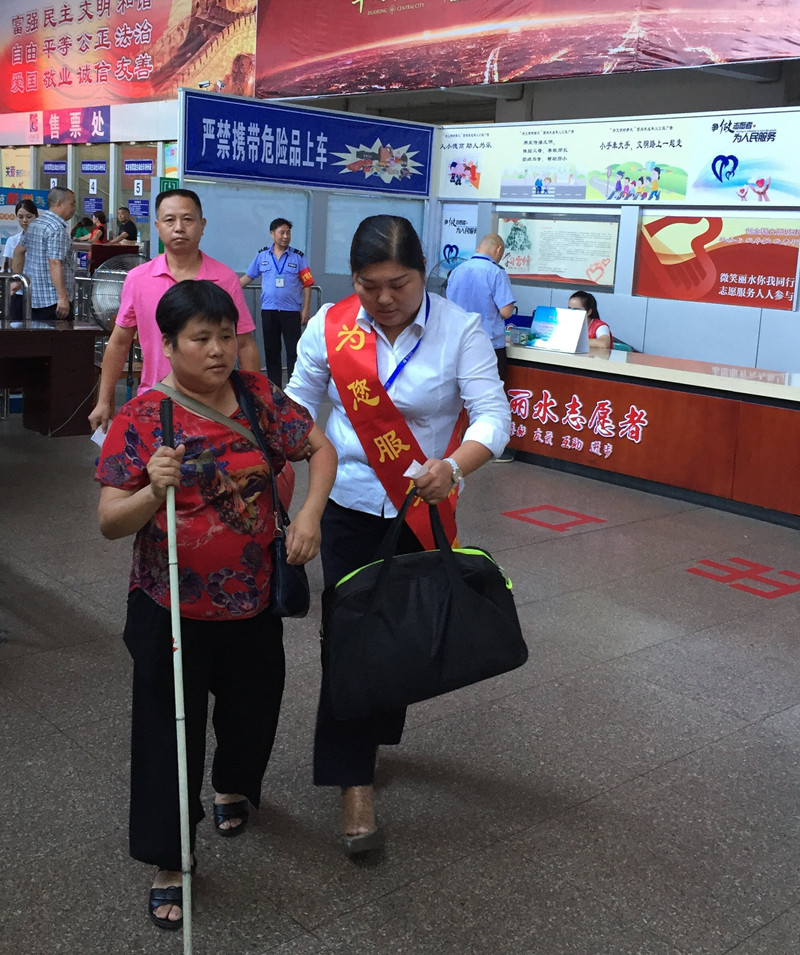 大姐的眼睛因?yàn)橐荒昵暗昧思膊?dǎo)致看不見(jiàn),今天到東站準(zhǔn)備坐車去縉云。當(dāng)時(shí)正在售票廳引導(dǎo)一米線的毛麗珍看到了正慢慢摸索、一步步小心翼翼往前走的大姐。她趕緊上前扶著大姐并幫她購(gòu)買了去縉云的車票,看她行走不方便,毛麗珍就一路扶著她,并一直送她到車上。別看毛麗珍人長(zhǎng)得大個(gè),可她的心卻細(xì)著,哪里需要轉(zhuǎn)彎,哪里有臺(tái)階,哪里需要注意的,她都一一耐心的提醒大姐小心注意。