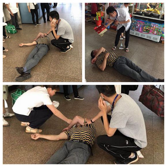 5月22日11時10分,東站的東大門進口通道上,一名中年男子突然倒地,全身不停地抽搐,翻著白眼,嘴里不時往外冒出嘔吐物。這一幕恰巧被正在巡查場地的辦公室主任陳樂觀看到。陳樂觀趕緊上前查看,并急忙撥打120、110。聞訊趕來的業(yè)務站副站長封慧麗和潘何豐也加入了幫忙的隊伍。