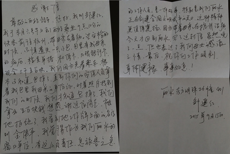 盡快送回“救命錢”,對金偉平來說,是做好本職工作,但對鄒女士母女來說,卻也猶如雪中送炭,正如鄒女士在信中寫道,“作為我們麗水的窗口單位(客運西站),有這樣負責(zé)任,急旅客之急的工作人員,是一件好事,特別是我們麗水正在創(chuàng)建全國文明城市的關(guān)口,這種精神更值得表揚?!?/p>