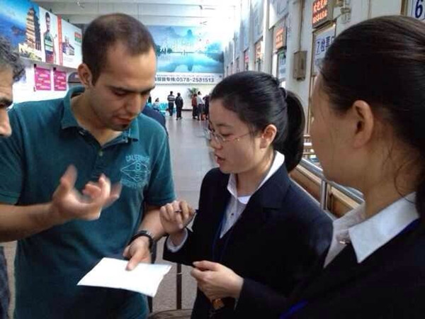 兩名外國旅客因為有要事,等不了9:40的車。經(jīng)過葉菁的一再溝通,乘客在通完一通電話后表示自己的朋友愿意開車送他們?nèi)チx烏,就不再乘車了。充當“翻譯”的葉菁又向宣站長轉(zhuǎn)達了他們的意思,站長當即給他們辦理了退票手續(xù),手里握著退回金額的兩名外國旅客連連道謝,念叨著:“Thank you! Thank you!"并對葉菁的熱心幫忙豎起了大拇指。