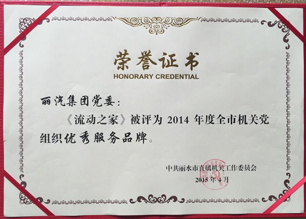 近日,麗汽集團“流動之家”服務(wù)品牌在中共麗水市直屬機關(guān)工作委員會開展的2014年度全市機關(guān)黨組織優(yōu)秀學(xué)習(xí)品牌、優(yōu)秀服務(wù)品牌評選活動中,喜獲“2014年度全市機關(guān)黨組織優(yōu)秀服務(wù)品牌”稱號。